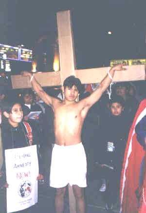 of being "illegal" and a suspected "terrorist". He was crucified on the