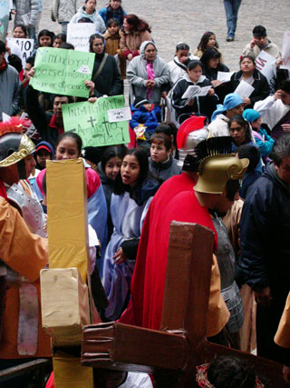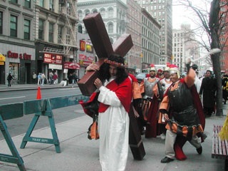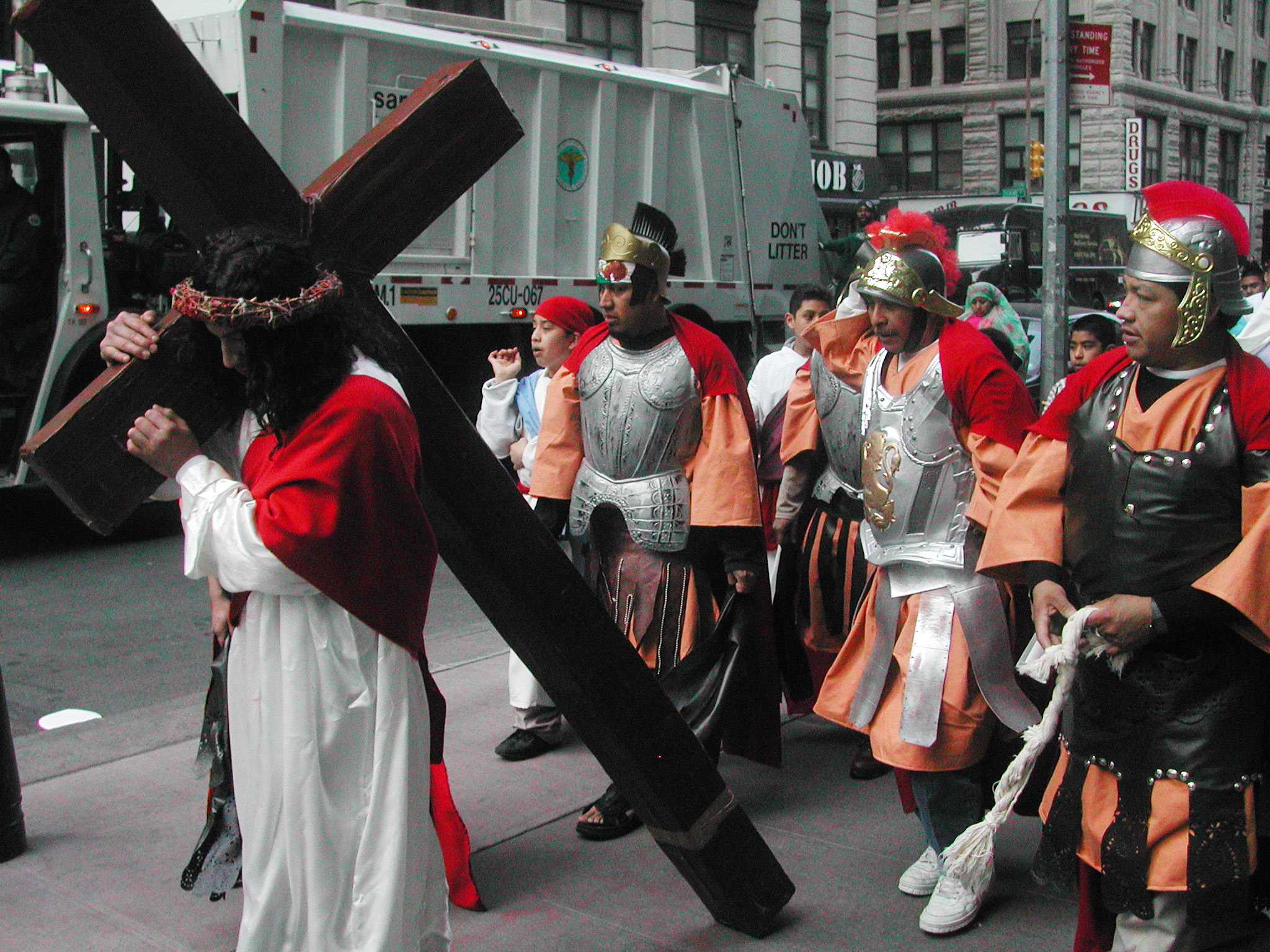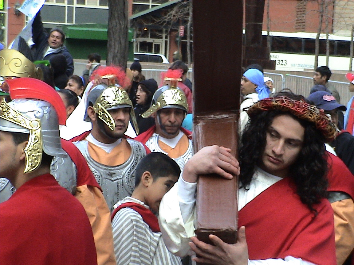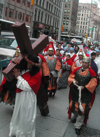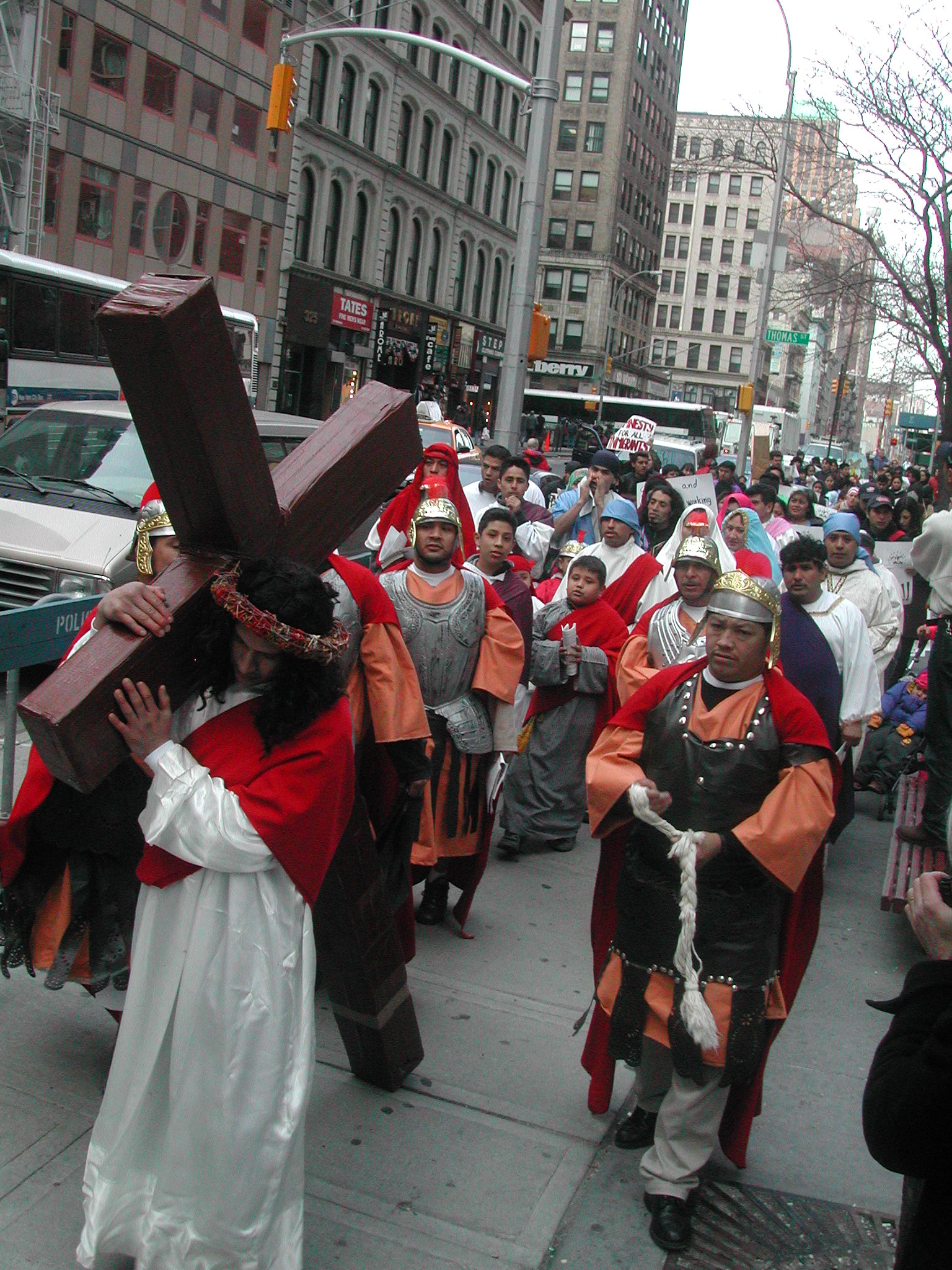 This is the seventh year that Asociación Tepeyac de New York organizes the live Viacrucis, that begins at 4:30 pm with a small protest in front of the INS Building, symbol of the immigration laws that keep more than 11 million immigrants in the United States undocumented. The economic system of the United States requires cheap workers, the law makes them illegal because they are more profitable by can remaining invisible and not appearing on the accounting books, thus lowering production costs and making it possible to offer competitive prices. Therefore, immigrants should be anonymous slaves, so they can be exploited. The law makes them illegal so they can be taken advantage of, while society accuses them and makes them the target of many attacks, and they are judged as guilty, even though their suffering demonstrates the failure of the country and of the neoliberal economic model.